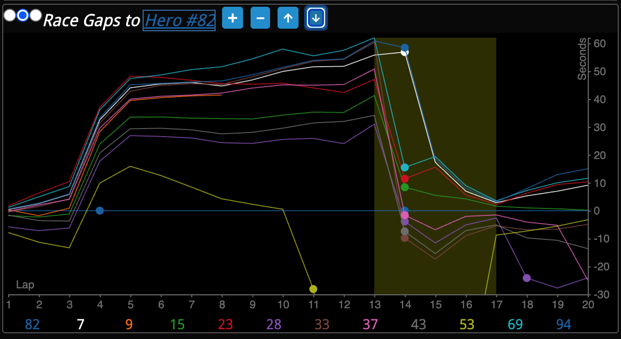 The Race Gap Chart visualizes the race via a lap-by-lap