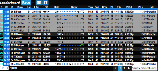 The Track Order panel accompanies track map to help visualize IMSA Full Course Yellow Pass-Arounds behind SC or overall leader. Ordering is updated at every intermediate timing loop crossing.