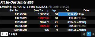 The Pit In-Out Stints panel displays both the session chronology and summary of driver and pit lanes times for the selected car. The pit-in and pit-out time line crossings divide the chronology.